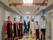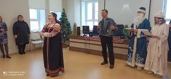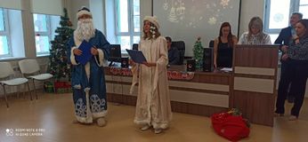 Ребята с театрального отделения Болотова Вера и Чернов Антон в образах Снегурочки и Деда Мороза выступили в качестве ведущих концерта, поздравив медперсонал с наступающим Новым годом.