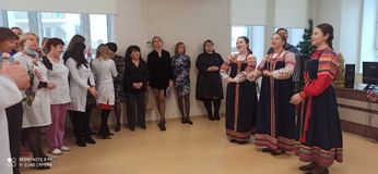 Перед работниками поликлиники выступили с концертными номерами учащиеся отделения фольклорного искусства Гнусарева Ольга, Чапурина Дарья, Узбякова Элина (преподаватель Скорнякова Ю.Н., концертмейстер Суняйкин С.И.), наши юные гитаристы Страничук Роман и Горбунов Матвей (преподаватель Геймур П.Н.).