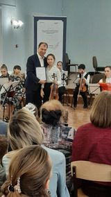 17 февраля 2024 года Кошелева Анна-Мария, учащаяся 6 класса отделения струнных инструментов (преподаватель Бычкова Наталья Анатольевна, концертмейстер Бугакова Людмила Анатольевна), приняла участие в мастер-классе Свистунова О.Г., профессора кафедры музыкального образования МГИКа РАМ имени Гнесиных. Мероприятие состоялось в МБУДО "ЦДМШ" в рамках Всероссийского конкурса "Мы рождены для вдохновения" (региональный этап).