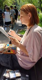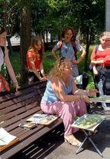 Любовь Владимировна Зинченко, член Международного союза педагогов-художников, провела мастер-класс "Акварель на пленэре", где продемонстрировала особенности работы с профессиональными материалами: специальной бумагой "ГАММА", качественными кистями, акварельными красками "Старый мастер", "Ботаника" и минеральной акварелью в тубах.